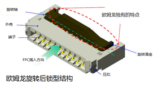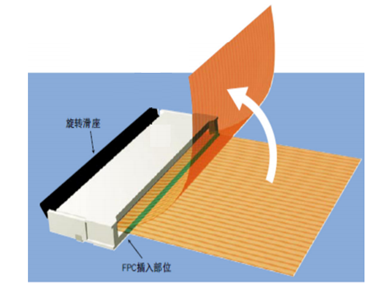 一、 旋轉式滑座從FPC插入口獨立出來。這樣一來,提起FPC時,滑座并不會斷開。這就保證了即使受到過度的外力,安裝好的FPC也不會脫開。