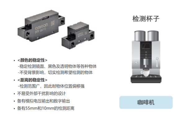 歐姆龍限定反射型傳感器B5W應(yīng)用在咖啡機(jī)中,這個(gè)系列的傳感器具有哪些特點(diǎn)呢,如下: