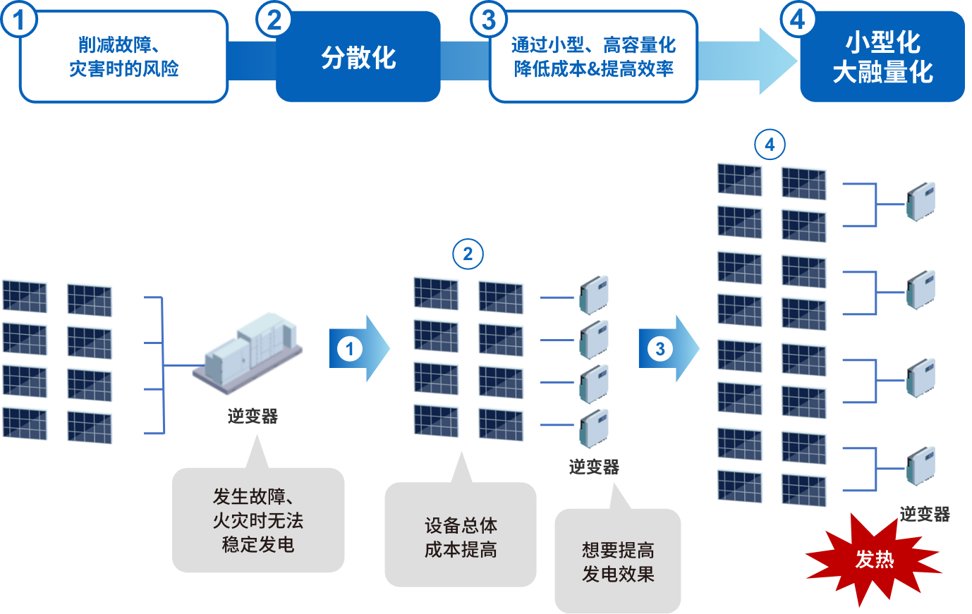 近年來,太陽能發(fā)電系統(tǒng)上的需求不斷發(fā)生變化。作為地震或水災(zāi)等災(zāi)害風(fēng)險對策,更加穩(wěn)定的電力供給需求愈發(fā)高漲,并出現(xiàn)了從集中型系統(tǒng)向分散型系統(tǒng)轉(zhuǎn)化的趨勢。并非通過1臺光伏逆變器執(zhí)行電力轉(zhuǎn)換,而是分散至多臺光伏逆變器,由此降低了發(fā)生災(zāi)害時因設(shè)備故障等所致發(fā)電停止的風(fēng)險。此外,各設(shè)備或機器上通過高容量、大電流化的配置提高了發(fā)電效率,并通過小型化、輕量化削減了設(shè)備投資,因而要求有效利用設(shè)備的呼聲愈發(fā)高漲。而另一方面,伴隨小型化、高容量化的發(fā)展,當(dāng)務(wù)之急是減少設(shè)備本身產(chǎn)生的熱量,這是造成能量損失和降低設(shè)備使用壽命的一個因素。