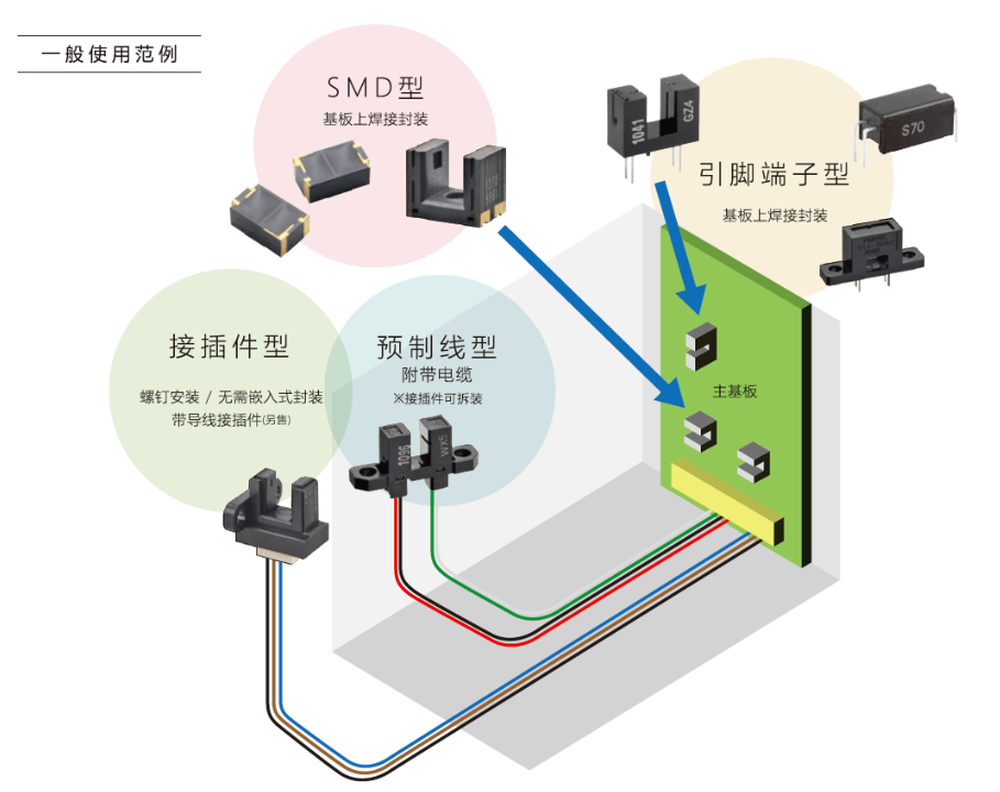 · 請根據設備選擇電路板封裝、嵌入、螺釘安裝等的安裝方法。此外,還備有表面封裝、通孔封裝、預制線連接、連接器連接等各種連接方式。