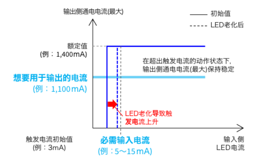 晶體管耦合器在增大輸入側電流時,輸出側電流也會變大,所以與MOS FET繼電器相比,會消耗更多的電力。LED老化會使輸出也跟隨減弱,由此需要更多的電力;