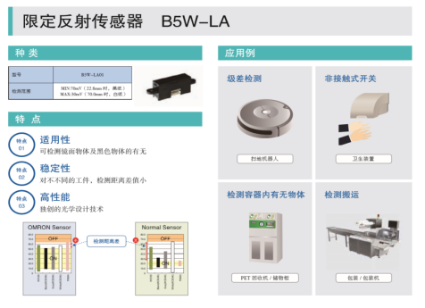 歐姆龍反射型傳感器可以使掃地機(jī)在運(yùn)作中遇到障礙物時(shí),可透過機(jī)身感應(yīng)而變換方向,避開桌椅角、臺(tái)階等,減少碰撞、防止掉落機(jī)會(huì),歐姆龍限定反射型傳感器B5W-LA01可以檢測(cè)鏡面反射物體和透明物體,不易受檢測(cè)物體顏色,材質(zhì)影響,穩(wěn)定性高,模擬電壓輸出,最高檢測(cè)距離70mm。