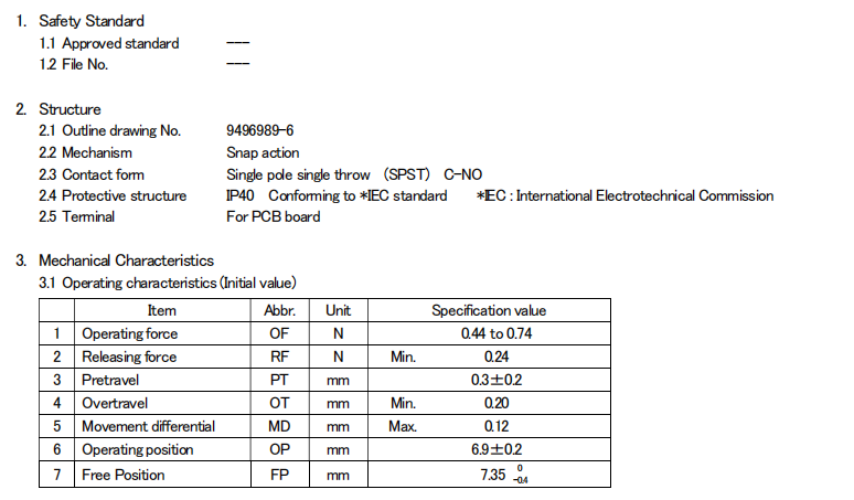 D2FC-F-7N, 克力為:60+/-15G,壽命為500萬次;