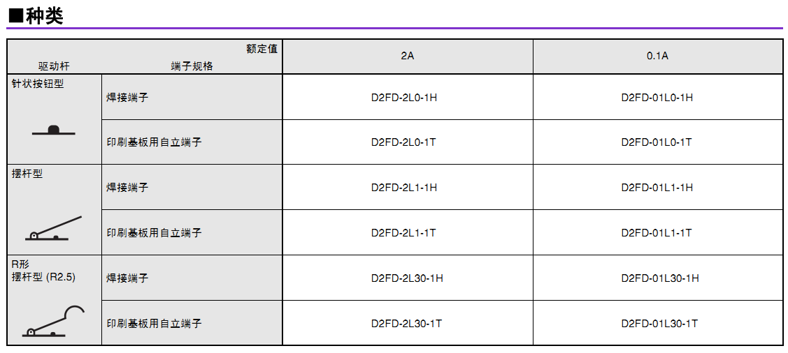 • 可動片為1片彈簧構造,支持AC125V 2A開關,更有微小負載型可供選擇。