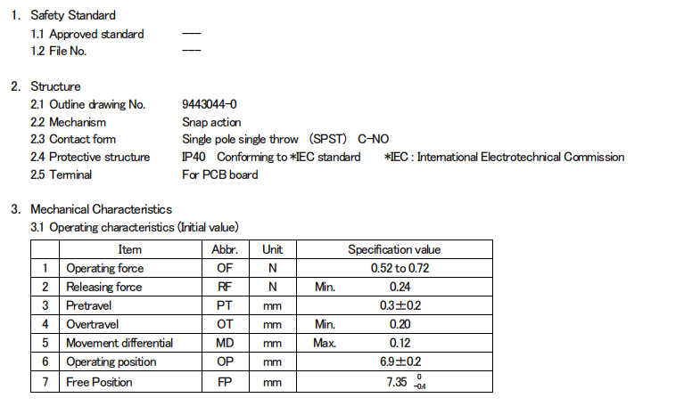 D2FC-F-7N (20M) 克力為:60+/-15G,壽命為2000萬次;