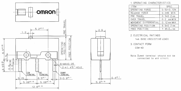 • D2FC-F-7N(10M)OF  1000萬次鼠標開關屬于超級小型基本開關,外殼尺寸為:12.8*5.8*7.3(mm)