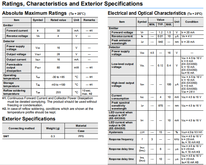 光電IC輸出(遮光時(shí)ON(EE-SX3350)/入光時(shí)ON (EE-SX4350)備有2種型號(hào))